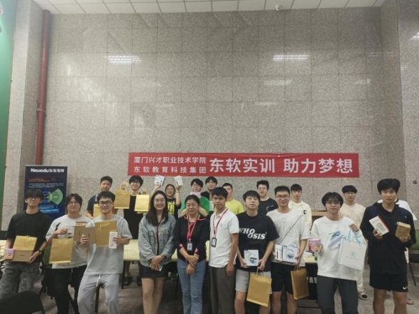 活动最终在欢声笑语中落下帷幕,并为表现优异的团队和个人颁发了纪念品。活动结束后,全体学员与东软教育的导师们合影留念,背景板上“东软实训 助力梦想”的标语,正是此次活动的完美注脚。